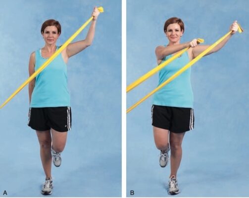 - Ở tư thế nửa quỳ, vòng một dây tập dưới bàn chân trước và để người tập thực hiện các mẫu chéo trên của chi trên chống lại lực cản (Hình 3 A).