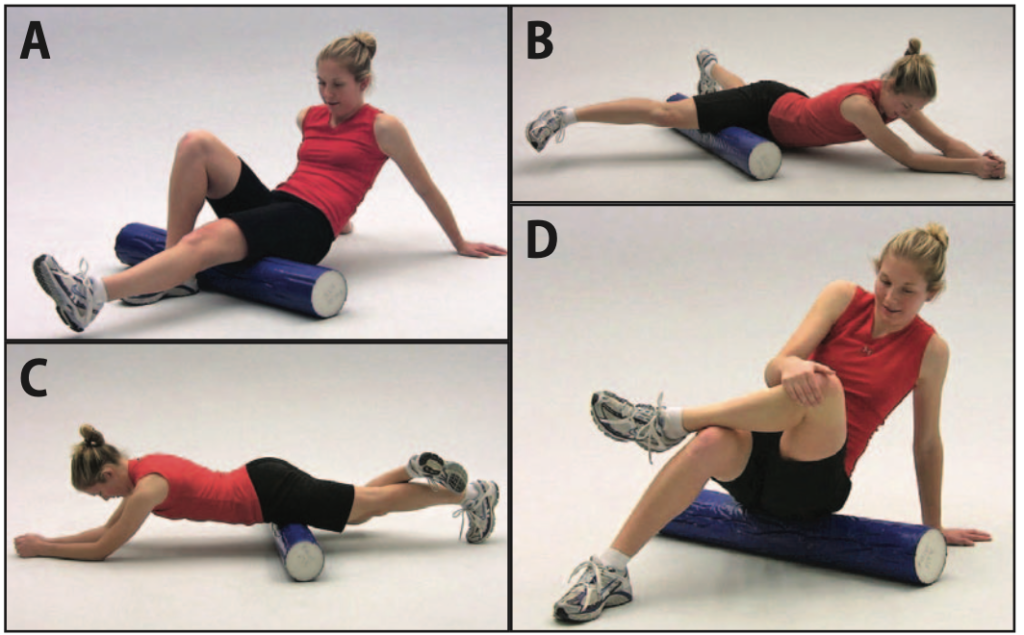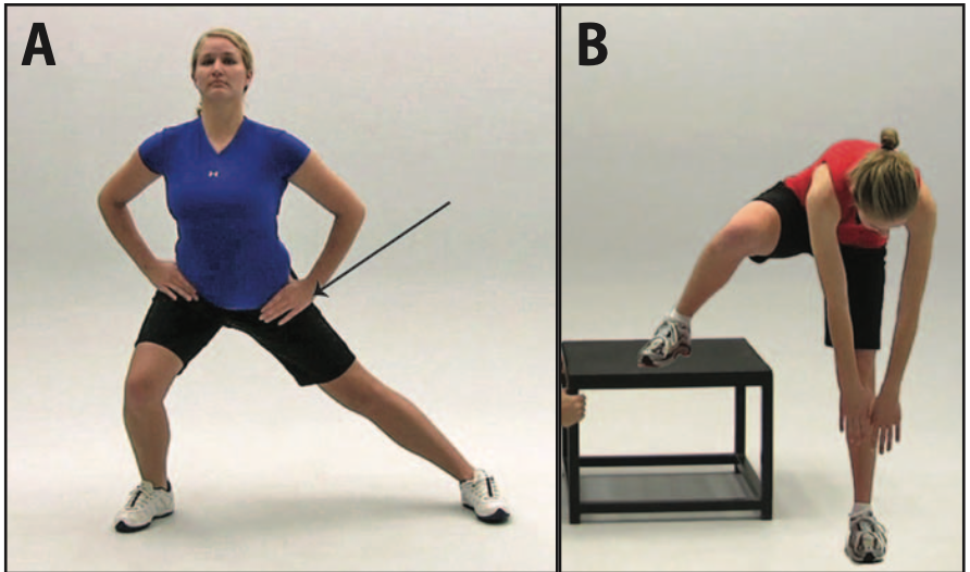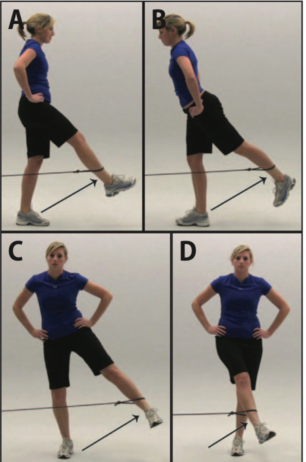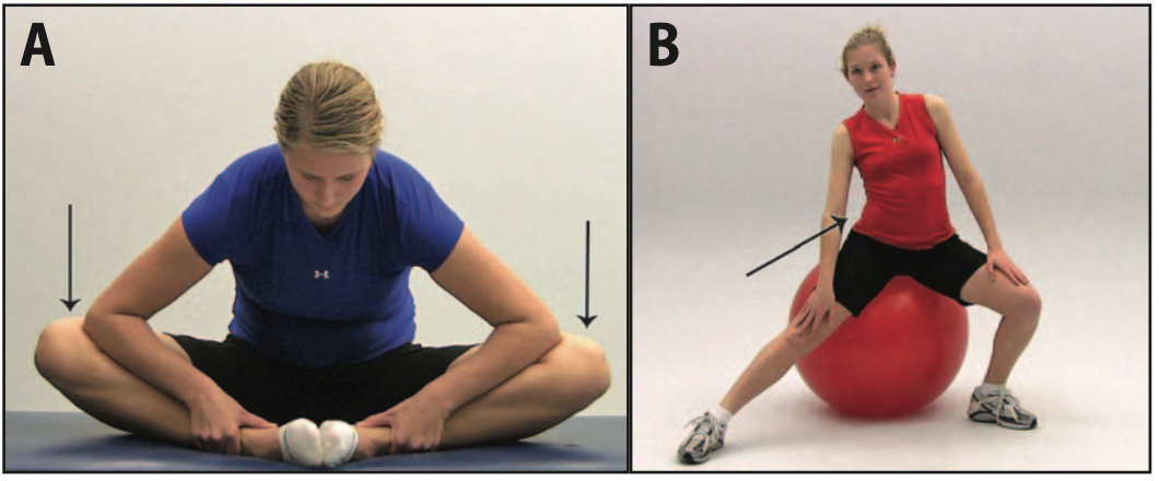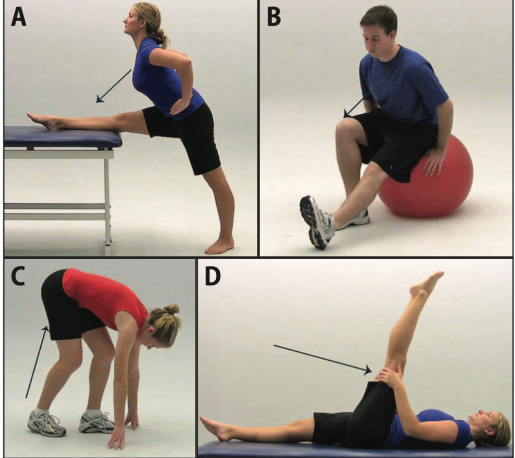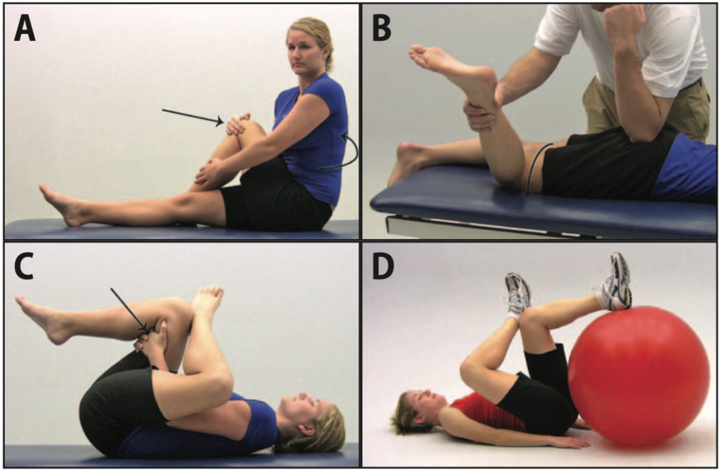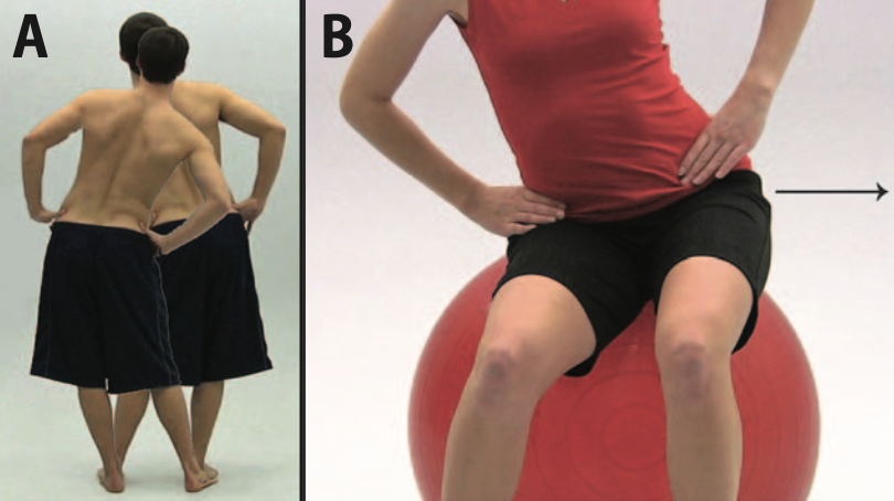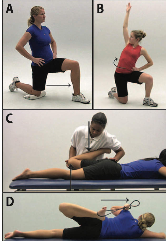 Chuyển hông sang bên khi đứng (A), khi ngồi trên bóng tập (B)Kéo dãn cơ gấp háng (A) ở tư thế quỳ, (B) kèm xoay thân, (C) kéo dãn bằng tay ở tư thế nằm sấp, (D) nằm nghiêng với dây kéo