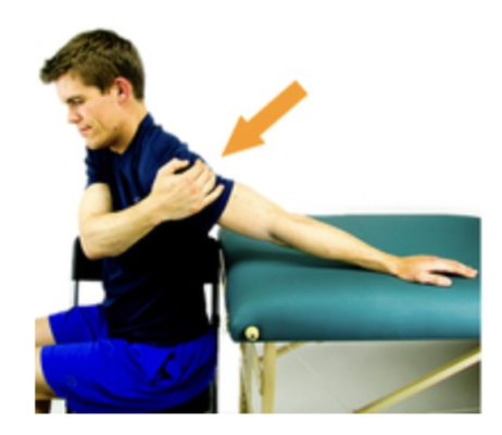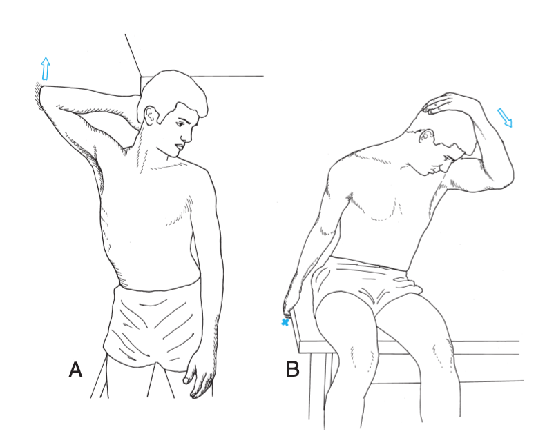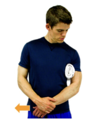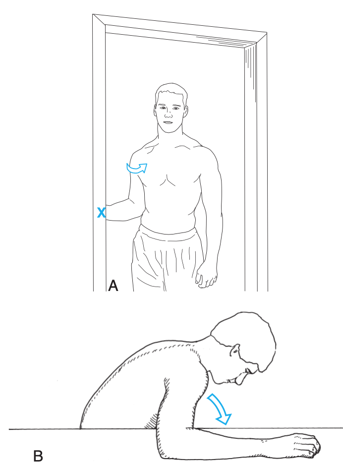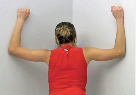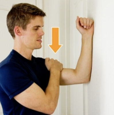 Đặt cẳng tay cần di động lên tường ở phía trước, khuỷu gập, ngang mức vai. Sau đó, dùng tay kia đẩy đầu trên xương cánh tay hướng xuống dưới.