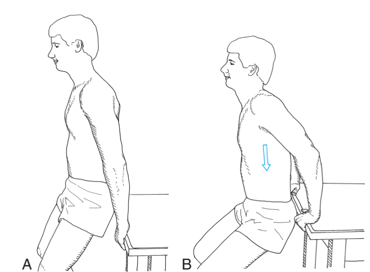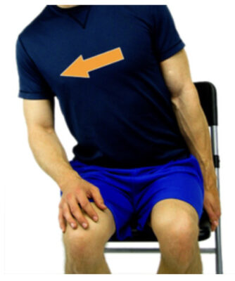 Ngồi trên ghế, bàn tay nắm cạnh bên của ghế, từ từ nghiêng người sang bên đối diện cho đến khi cảm thấy kéo giãn nhẹ ở vùng vai. Vai phải giữ thả lỏng