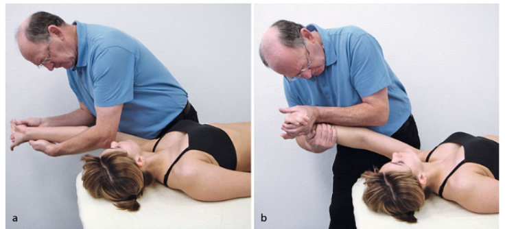 - Ví dụ: động tác xoay nửa thân dưới ở tư thế gập háng gối (hook-lying). Người điều trị quỳ mặt hướng đến bệnh nhân và hai gối đặt cạnh hai bàn chân để giữ vững chân. Tiếp xúc bằng tay ở mặt ngoài gối hoặc đùi để dễ dàng kiểm soát. Thân mình của người điều trị di chuyển sang bên này rồi bên kia cùng một khối với phần dưới của người bệnh, làm hai gối bệnh nhân di chuyển nhịp nhàng sang hai bên, làm cho thân mình của bệnh nhân xoay theo.