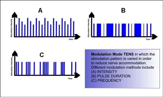 Kích thích sử dụng cho TENS thông thường thường được điều biến (tức là thay đổi theo thời gian) để hạn chế sự thích ứng (quen). Thích ứng là giảm tần số của điện thế hoạt động và giảm cảm giác chủ quan với kích thích khi kích thích điện được áp dụng mà không thay đổi về kích thích áp dụng. Thích ứng là một tính chất của các thụ thể cảm giác gây ra bởi giảm tính kích thích của màng tế bào thần kinh với các kích thích lặp đi lặp lại. Điều biến bất kỳ các thông số kích thích, bao gồm tần số, độ dài xung, và biên độ dòng, đều có thể phòng ngừa sự thích ứng với kích thích điện một cách hiệu quả. Tuy nhiên, điều biến không làm tăng tác dụng giảm đau của kích thích.