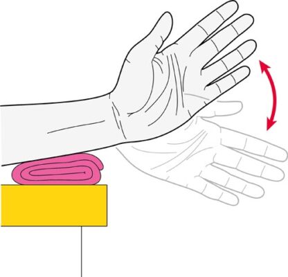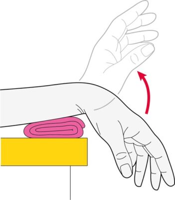 - Đặt cẳng tay của bạn trên một bề mặt phẳng, như bàn, với bàn tay buông thõng qua mép, lòng bàn tay hướng xuống. Để dễ chịu có thể đặt một chiếc khăn được cuộn lại dưới cổ tay.