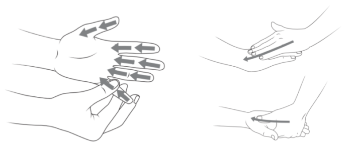 - Bàn tay và ngón tay: Dùng ngón tay cái và các ngón tay còn lại vuốt nhẹ nhàng từng ngón tay theo hướng từ đầu ngón tay về phía cổ tay (5-10 lần/ngón). Sau đó, xoa nhẹ nhàng mu bàn tay và lòng bàn tay theo hình tròn hoặc ép hướng lên.