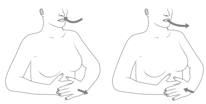 - Thở sâu: Ngồi hoặc nằm thoải mái, đặt tay lên bụng. Hít vào từ từ bằng mũi để bụng phình lên, sau đó thở ra chậm rãi bằng miệng mím lại để bụng xẹp xuống. Lặp lại 5 lần, nghỉ giữa mỗi lần thở nếu cần.