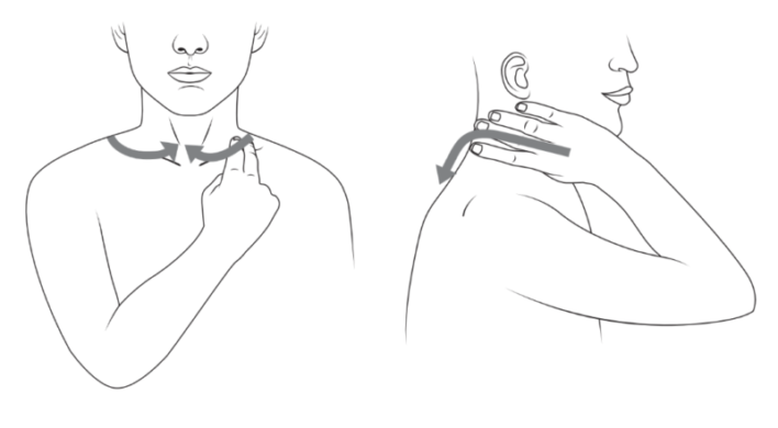 - Phía trước cổ: Đặt hai ngón tay giữa và áp út lên hai bên cổ, ngay trên xương đòn. Nhẹ nhàng vuốt xuống và vào trong hướng về xương đòn. Lặp lại 15 lần. Động tác này giúp dịch bạch huyết lưu thông về tim.