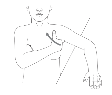 - Dùng các ngón tay của bàn tay lành nhẹ nhàng xoa theo hình zig zag hoặc hình tròn nhỏ quanh vùng nách ở bên tay đã phẫu thuật, đặc biệt chú ý vùng sẹo nếu có. Lặp lại 10-15 lần.