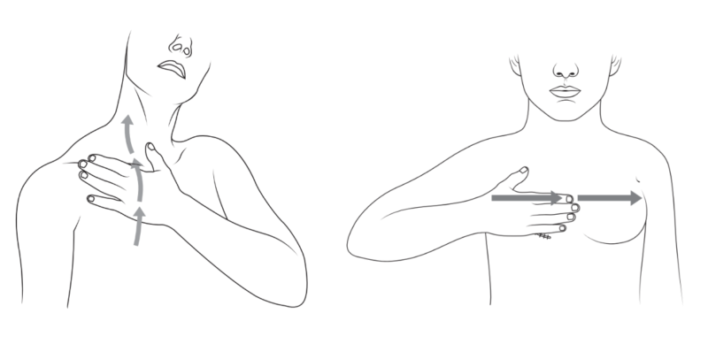 - Chuẩn bị vùng ngực (bên không phẫu thuật): Đặt lòng bàn tay lên vùng nách ở bên ngực không phẫu thuật. Dùng tay đối diện nhẹ nhàng vuốt từ vùng nách lên phía trên vai. Lặp lại 10-15 lần.. Bước này giúp chuẩn bị các hạch bạch huyết ở nách bên đó để tiếp nhận dịch.