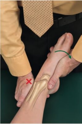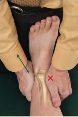 - Apply a posteriorly directed force through your hand contact at the anterior aspect of the talus.