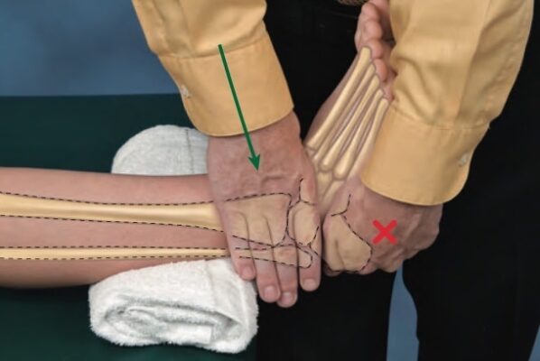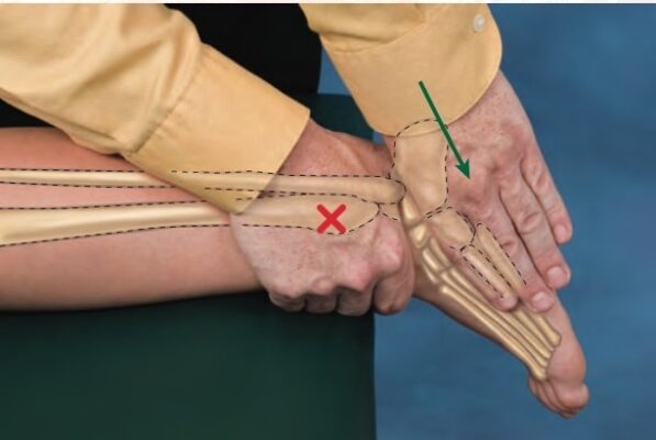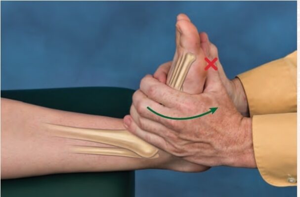 - The web space of both hands reinforce one another over the anterior aspect of the patient’s talus. Your forearms are in line with the posterior direction of force.