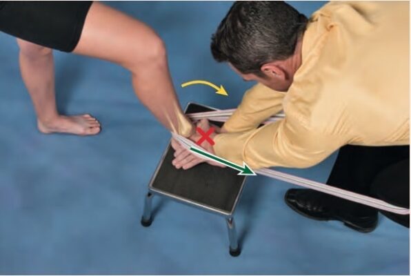- The patient slowly shifts weight onto his or her front leg while maintaining the heel in contact with the ground as you apply a posteriorly directed force through the talus contact against the stabilization provided by the belt.