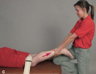 - The patient’s knee is flexed and his posterior thigh is stabilized by your trunk.