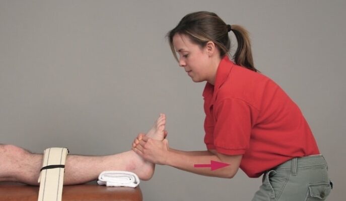 - Both of your hands are grasping the patient’s calcaneus with the thumbs forming a “V” over the lateral aspect of the patient’s calcaneus and your forearms in the direction in which force is applied. Stabilization is provided by your trunk.