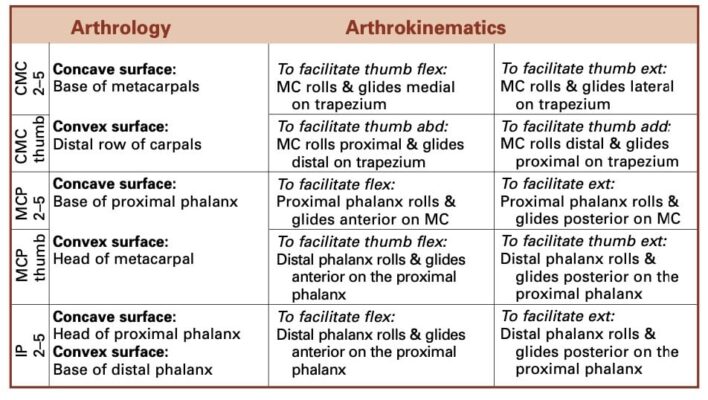 - For second to fifth CMC joint, glides toward the palm of hand to improve flexion and glides away from the palm to improve extension.
