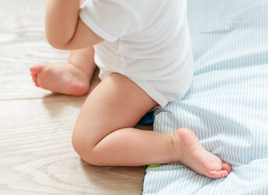 Tiếp theo, nâng hai hông của trẻ lên và đưa về phía bàn chân, vừa đủ để đạt được tư thế bốn điểm. Nếu trẻ cần hỗ trợ thêm dưới bụng, có thể sử dụng một miếng đệm, bục nhỏ hoặc gối để giúp giữ tư thế. Hãy nhớ rằng, bốn điểm có thể chỉ là một tư thế chuyển tiếp mà đứa trẻ sử dụng để chuyển sang tư thế quỳ hoặc ngồi. Không phải tất cả trẻ phát triển bình thường đều học bò bằng hai bàn tay và hai gối.