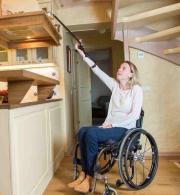 - Dụng cụ cán dài để tiếp cận (reacher), đặc biệt nếu NKT kiểm soát thân mình kém