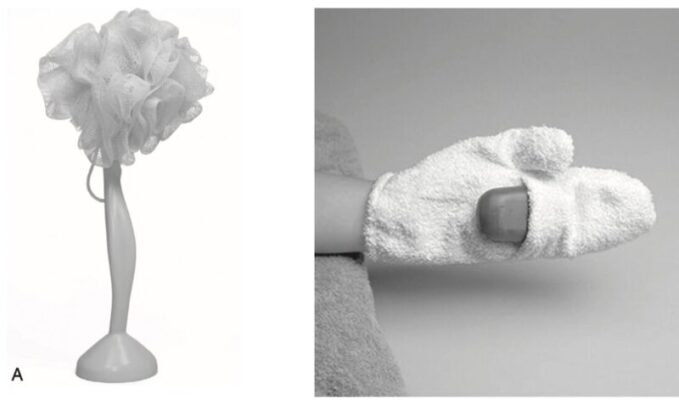 - Miếng bọt biển và bàn chải tắm có cán dài hỗ trợ tiếp cận