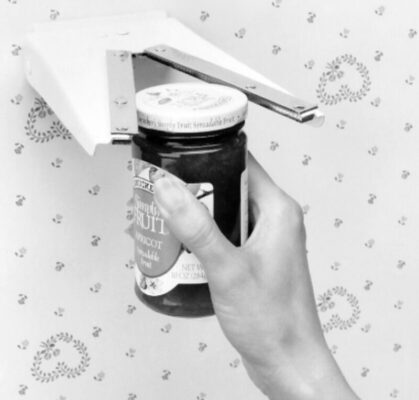 Dụng cụ mở lọ được gắn vào tường hoặc mặt dưới của tủ và cho phép tháo nắp vặn bằng một tay.