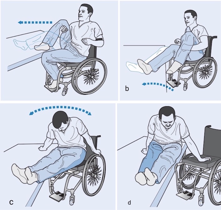 Cách phổ biến nhất để di chuyển từ sàn nhà lên xe lăn là đặt xe lăn một bên bệnh nhân. Một tay đặt lên góc trước của ghế ngồi và tay kia đặt trên sàn bên cạnh hông. Nâng người lên trên và sang bên vào xe lăn.