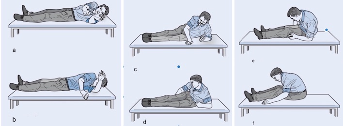 Dịch chuyển vào/ra khỏi giường có thể được thực hiện với chân hai đưa lên (legs up), hoặc đặt chân xuống (legs down) hoặc bằng một chân lên và một chân xuống. Có những ưu điểm và nhược điểm của mỗi cách tiếp cận.