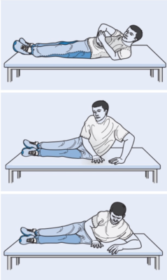 Cách thứ nhất là lăn sang nằm nghiêng và sau đó ngồi dậy từ tư thế nằm nghiêng. Cách làm này tuy rườm rà nhưng tương đối dễ dàng. Liệt cơ tam đầu có thể gây khó khăn cho động tác đẩy người dậy. Bệnh nhân liệt tứ chi C6 có thể khắc phục được vấn đề này bằng cách giữ tư thế nằm nghiêng và ‘bước’ một hoặc cả hai khuỷu tay quanh thân mình hướng về phía đầu gối. Từ vị trí này, tay trên được móc dưới chân trên để kéo người sang tư thế ngồi.