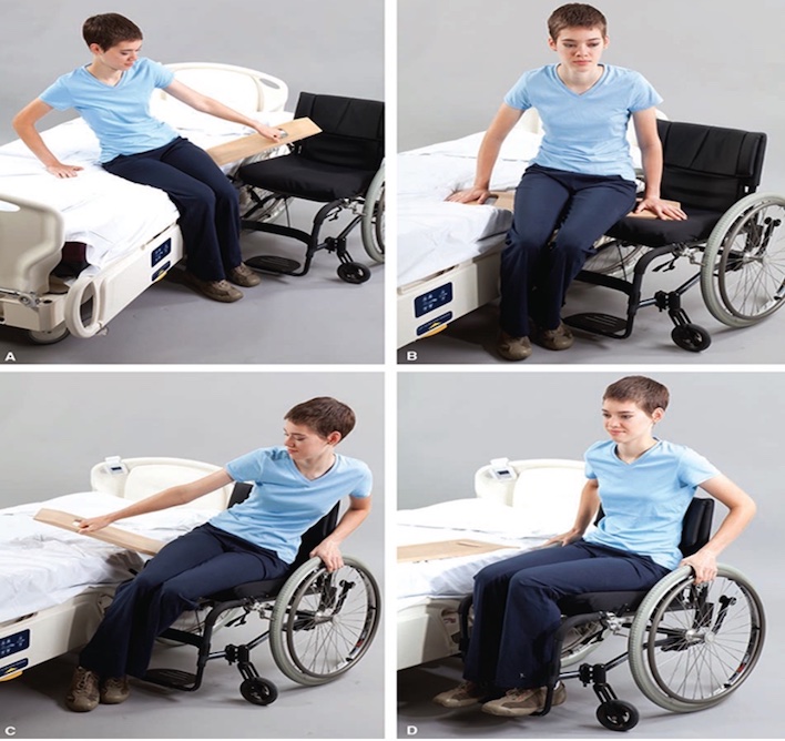 Một cách khác để chuyển từ tư thế nằm sang tư thế ngồi là sử dụng cánh tay trên để đẩy thẳng sang tư thế ngồi từ tư thế nằm ngửa (xem Hình 4). Bệnh nhân liệt nửa thân dưới đặt hai bàn tay ra phía sau thân mình. Sau đó, họ ấn xuống hai bàn tay và duỗi khuỷu tay để nâng thân mình. Liệt cơ bụng có thể làm cho việc đưa hai tay ra sau khó khăn. Bệnh nhân liệt tứ chi C6 cũng có thể chuyển trực tiếp từ tư thế nằm ngửa sang tư thế ngồi; tuy nhiên, cách này thường rất khó và gây đau vai và do đó nên tránh sử dụng.
