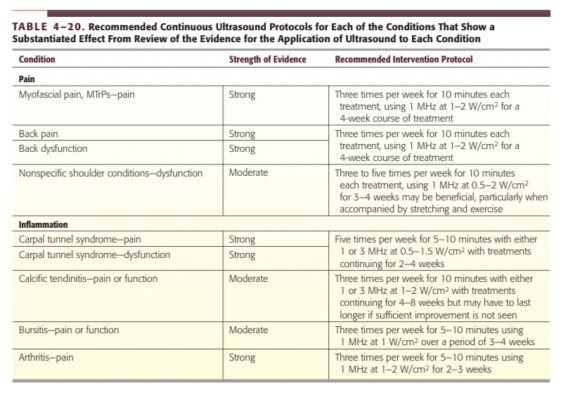 - Số lần và tần số điều trị: Số lần điều trị phụ thuộc vào các mục tiêu của điều trị và đáp ứng của bệnh nhân. Nếu bệnh nhân đang tiến triển với một tốc độ thích hợp so với mục tiêu, nên tiếp tục điều trị. Tần số của phương pháp điều trị phụ thuộc vào mức độ của siêu âm được sử dụng và các giai đoạn lành. Siêu âm mức tác dụng nhiệt thường chỉ được áp dụng trong bán cấp hoặc giai đoạn mạn tính, tần số điều trị được đề nghị là 3 lần một tuần; siêu âm ở mức phi nhiệt có thể điều trị trong giai đoạn sớm hơn và áp dụng hàng ngày.