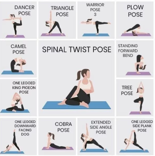 Yoga liên quan đến các tư thế cơ thể (asana) khác nhau từ đơn giản đến phức tạp và các bài tập thở. Thở chậm, sâu, bằng cơ hoành là một phần quan trọng của yoga. Các tư thế khác nhau nhằm tăng cường khả năng vận động và độ mềm dẻo. Tuy nhiên, người tập phải thận trọng khi thực hiện các tư thế yoga. Một số tư thế có thể nguy hiểm, đặc biệt đối với những người chưa có kinh nghiệm về kỹ thuật yoga.