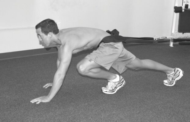 - Tư thế bệnh nhân và kỹ thuật: Trong khi đeo dây đai vòng quanh thân và xương chậu, yêu cầu người tập di chuyển từ vị trí bắt đầu giống như chuẩn bị chạy nước rút và sau đó chạy về phía trước với lực cản của dây đàn hồi loại nặng (lớn) được gắn vào dây đai và cố định vào tường hoặc bề mặt tĩnh (Hình 16). Hoặc là người tập có thể thực hiện chạy lùi chống lại sức cản.