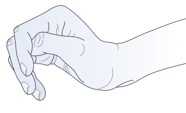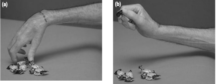 Trong cầm nắm kiểu kẹp mé bên, búp của ngón cái tiếp xúc với mặt bên của ngón trỏ (hình 8) và trong cầm kiểu gọng kìm, đầu ngón cái tiếp xúc với đầu ngón trỏ (hình 9). Kiểu cầm nắm đạt được chủ yếu được xác định bởi khả năng giãn dài của các cơ khép ngón cái. Kiểu gọng kìm đạt được nếu các cơ khép ngón cái có thể giãn dài được và kiểu cầm nắm kiểu kẹp mé bên đạt được nếu cơ khép ngón cái không thể kéo dài được.