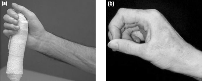 Cách tiếp cận thứ hai tích cực hơn là gập các khớp MCP và khớp liên ngón gần PIP của các ngón tay với ngón cái được đặt áp vào mặt bên của ngón trỏ. Điều này thường được thực hiện bằng dùng băng dán lên mặt lưng của các ngón tay và ngón cái (hình 11). Cổ tay được giữ ở tư thế duỗi bằng nẹp. Nếu sử dụng phương pháp thứ hai này, bàn tay cần được theo dõi cẩn thận và bệnh nhân nên dành ít nhất một khoảng thời gian mỗi ngày để duỗi thẳng các khớp liên ngón gần PIP. Ngoài ra, nên thường xuyên thực hiện tầm vận động thụ động đối với các khớp PIP. (Khi duỗi khớp IP cần gập cổ tay và khớp MCP để tránh kéo căng các cơ gấp ngón tay ngoại sinh (hình 12).