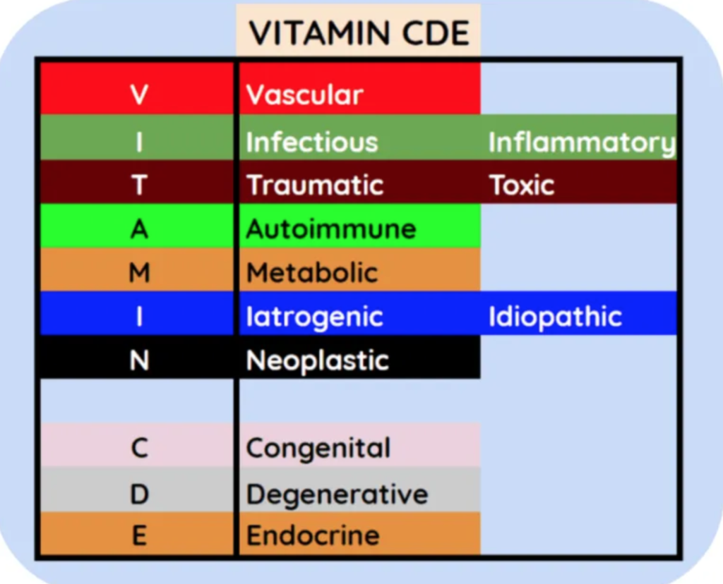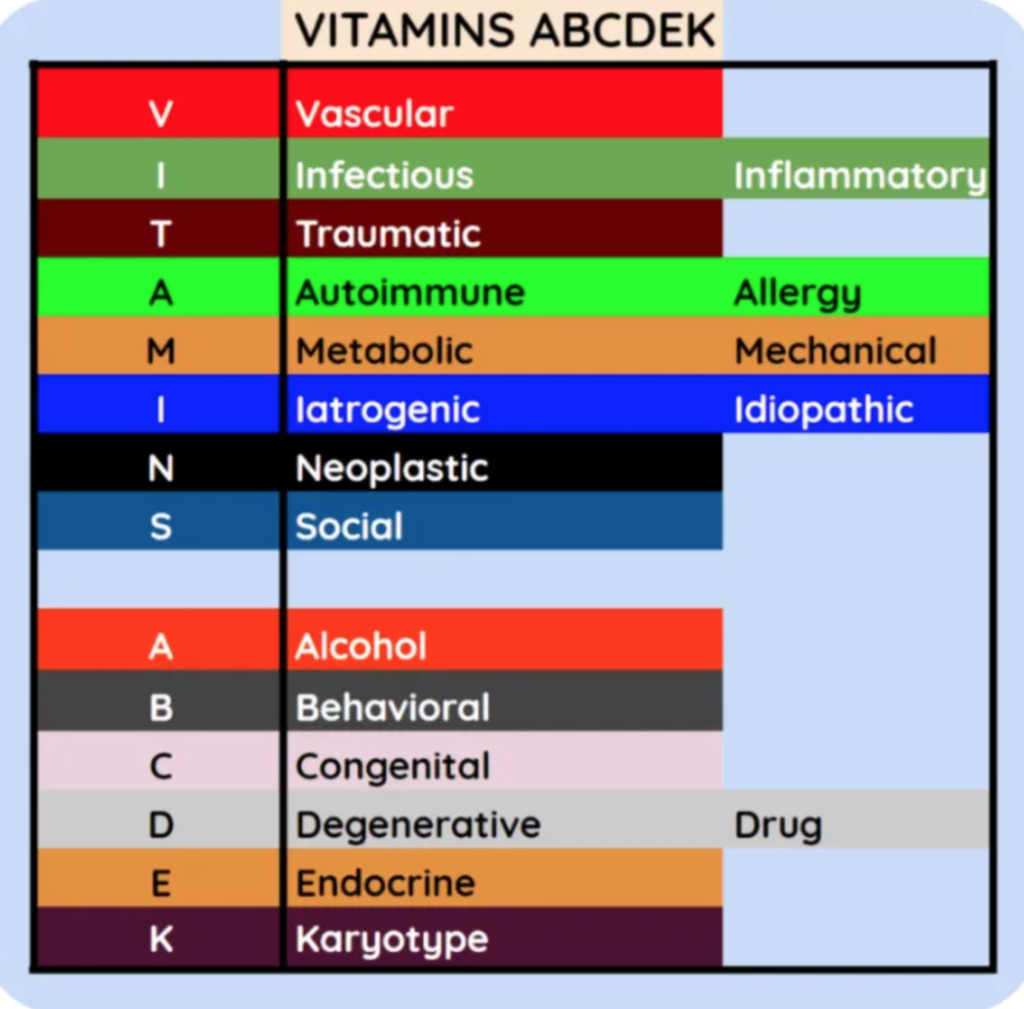 Vậy là tôi đã liệt kê cho bạn ba cách để nhớ về nguyên nhân khi chẩn đoán phân biệt. Mong rằng khi gặp một trường hợp nào khó chẩn đoán, bạn có thể vận dụng một trong ba cách này và phân biệt các khả năng để đi đến chẩn đoán chính xác cuối cùng. Đó chính là tiền đề cho mục tiêu và can thiệp cho bệnh nhân của bạn.