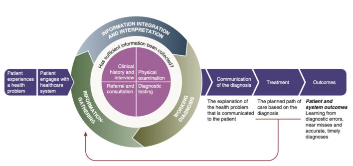 Quá trình chẩn đoán là một hoạt động hợp tác, phức tạp, lấy bệnh nhân làm trung tâm liên quan đến thu thập thông tin và suy luận lâm sàng với mục đích xác định vấn đề sức khoẻ của bệnh nhân. Quá trình chẩn đoán diễn tiến như sau:
