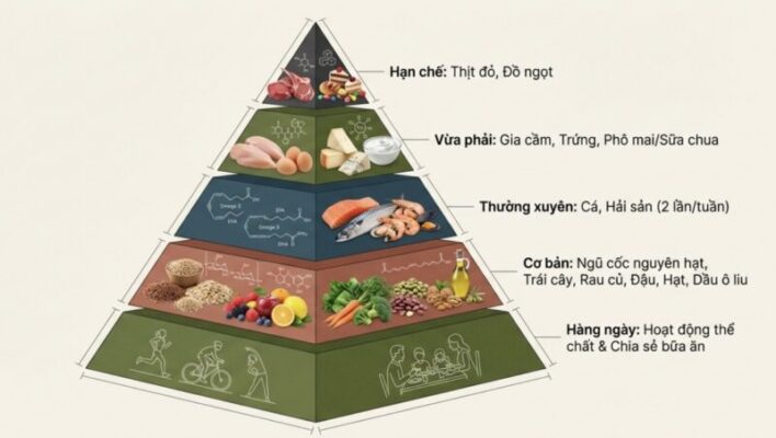 - Đạm động vật vừa phải: ưu tiên cá và hải sản, hạn chế thịt đỏ