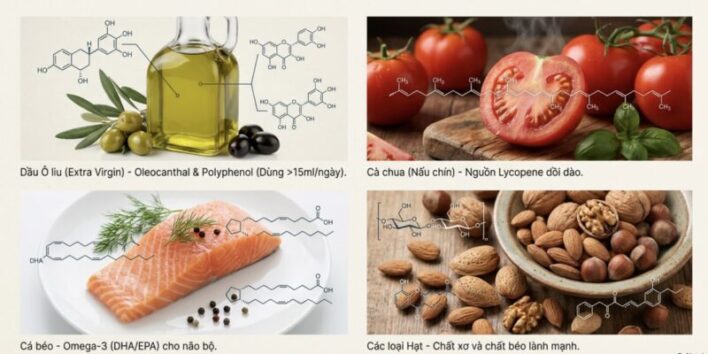 Dầu ô liu nguyên chất chứa oleocanthal – một hoạt chất có tính kháng viêm nhẹ. Kết hợp với omega-3 từ cá biển, rau xanh và đậu hạt, chế độ ăn này góp phần giảm tình trạng viêm mạn tính trong thoái hóa khớp và viêm khớp dạng thấp.