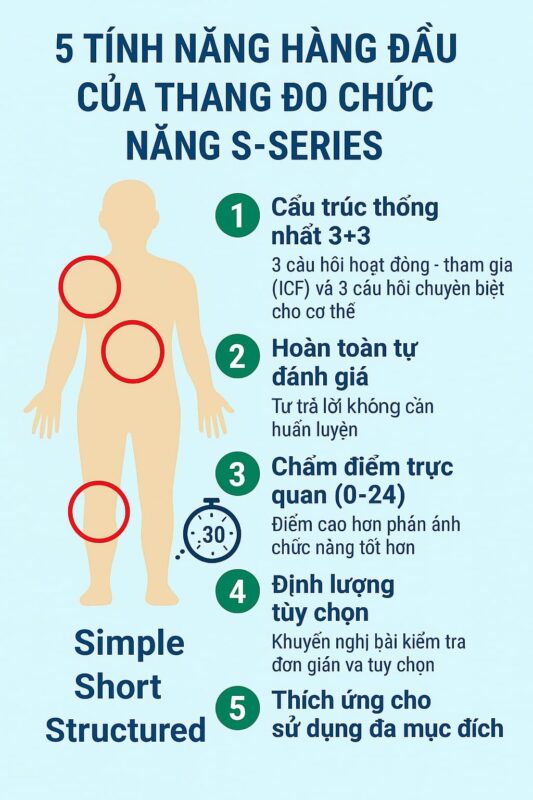 S-Series là hệ thống thang đo chức năng được Minh Dat Rehab phát triển nhằm giúp người bệnh, nhân viên y tế và cộng đồng tự đánh giá chức năng các vùng cơ thể một cách nhanh chóng, khoa học và dễ hiểu.