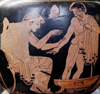 Một chiếc bình Hy Lạp từ năm 480 – 470 trước Công nguyên, được làm một hoặc hai thập kỷ trước khi Hippocrates ra đời, tả cảnh một thầy thuốc chăm sóc bệnh nhân.