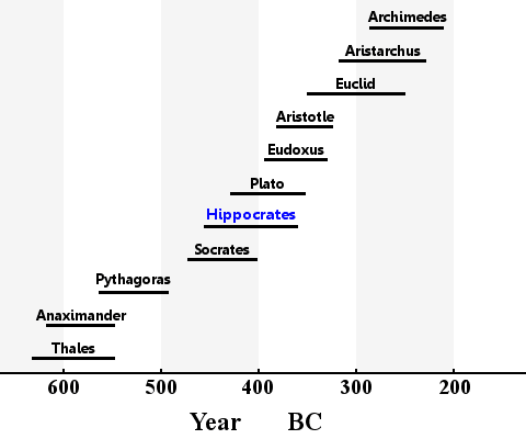 Tính theo các mốc thời gian của các học giả lừng danh thời cổ đại, Hippocrates sống sau Pythagoras; cùng thời với Socrates, Plato, và Democritus; và ông vẫn còn sống trong những năm đầu đời của Aristotle.