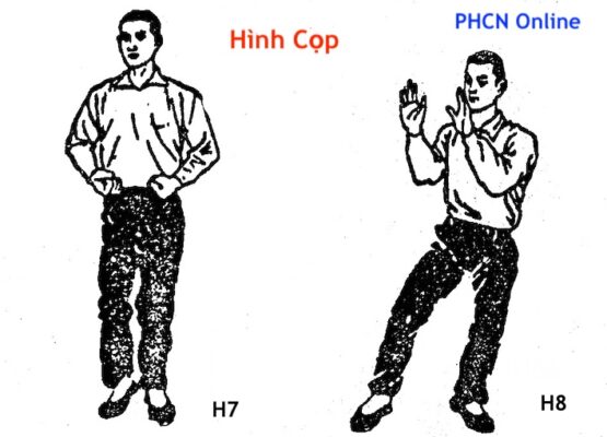 - (1) Chân trái tiến lên nửa bước, bàn chân phải theo đó đưa đến gần mắt cá chân trái, 2 chân sát nhau, gót chân phải hơi nhấc lên, lòng bàn chân phải chạm hờ mặt đất, 2 đầu gối co lại như nửa ngồi xổm, thành tả độc lập bộ; đồng thời 2 bàn tay nắm lại thu về 2 bên eo, lòng bàn tay ngửa lên, mắt nhìn ra trước bên phải (H. 7).