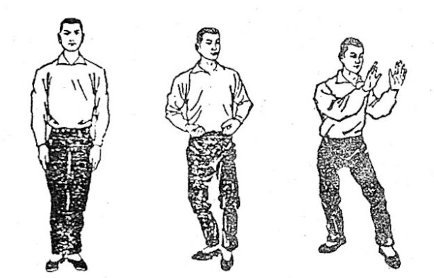 1. Tư thế chuẩn bị: Hai chân đứng thẳng, 2 tay thông xuống tự nhiên, mắt nhìn ngang trước mặt, bình tâm tĩnh khí đứng như vậy trong một lát.