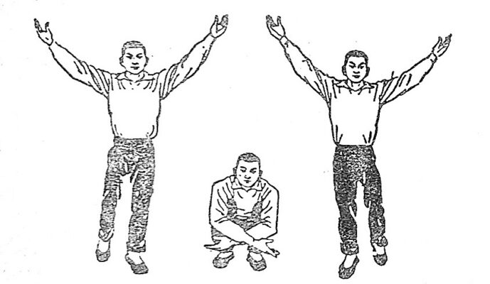 - (1) 2 chân từ từ gấp lại về phía dưới, thành tư thế nửa ngồi xổm, trọng tâm ở chân phải, chân trái ở sát mắt cá chân phải, gót chân hơi nhấc lên, lòng bàn chân chạm hờ đất, đồng thời 2 tay nắm thành quyền để sát 2 bên eo, 2 quyền ngửa lên, mắt nhìn phía trước bên trái (H 5)