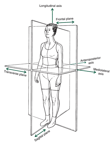 - Hệ tọa độ 3D dành cho các vận động trong không gian ba mặt phẳng (ví dụ động tác gấp và dạng đùi). Trong hệ tọa độ 3D, thứ tự mô tả là (ngang, thẳng đứng, trong-ngoài; hay x,y,z).