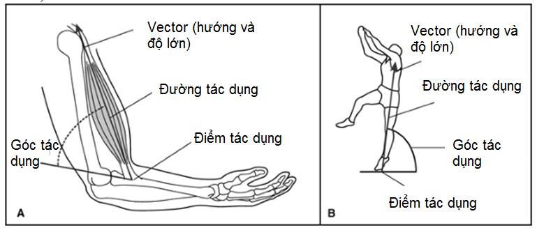 Hình 5-1 Các đặc tính của một lực. Lực cơ bên trong (A) và lực bên ngoài tạo lên nền đất trong động tác nhảy cao (B).