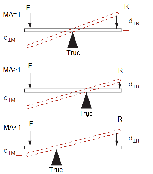 - Trường hợp hai, MA>1, cánh tay tác dụng lớn hơn cánh tay kháng. Trong trường hợp này, cánh tay tác dụng lớn hơn (dài hơn) làm tăng moment xoay tạo ra bởi lực tác dụng (phóng đại lực tác dụng).
