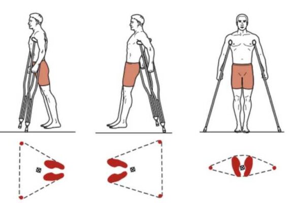 - Kích thước chân đế: Gia tăng chân đế thường gia tăng độ vững (ví dụ sử dụng khung đi hoặc nạng). Một cơ thể có thể vững ở hướng này nhưng không vững ở hướng khác. Ví dụ dang rộng chân có thể làm cho người đó vững ở hướng ngang nhưng không vững hơn ở hướng trước sau.