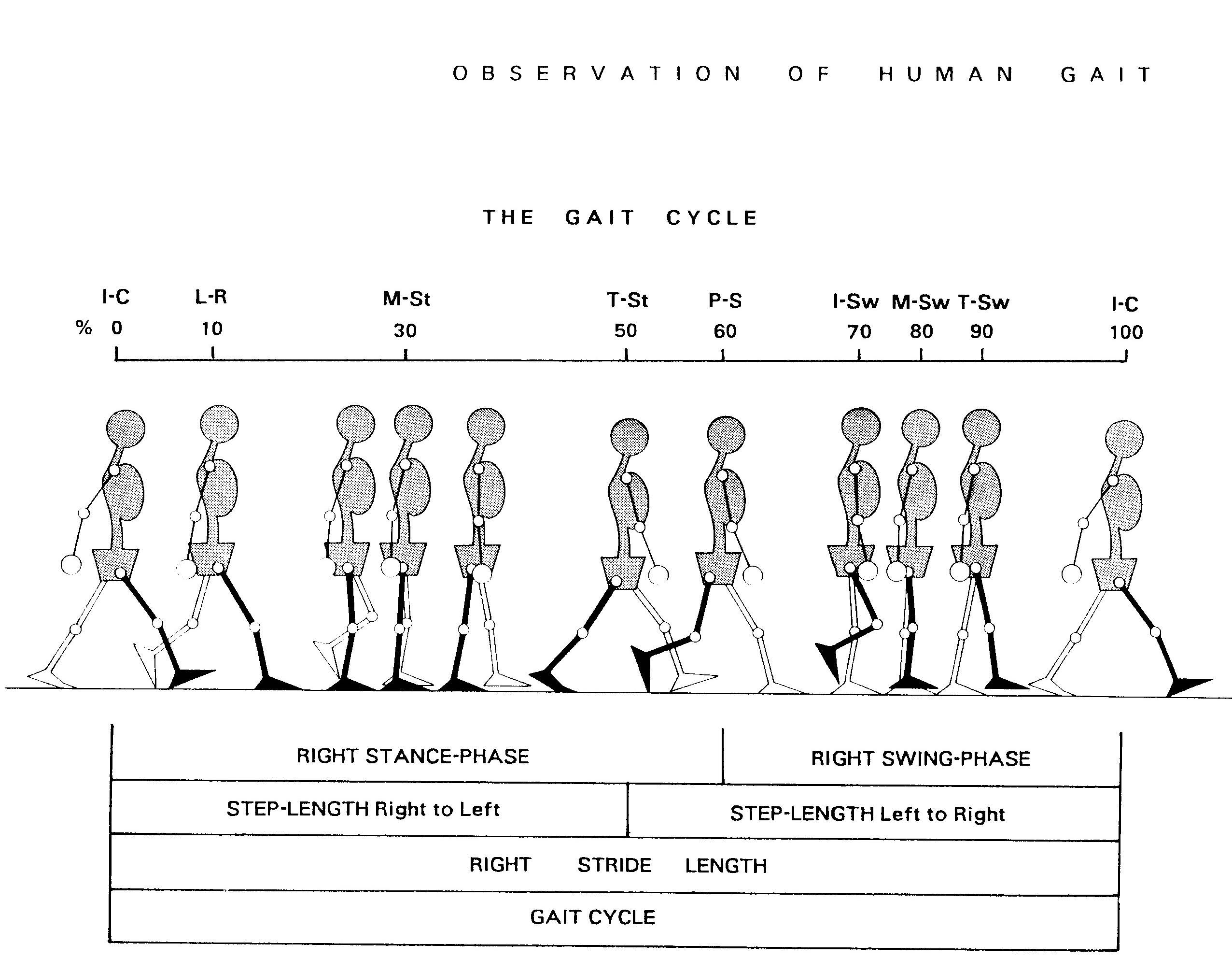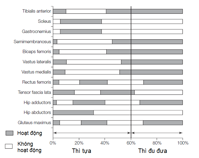 (Ghi chú: IC = Initial Contact (chạm gót); LR = Loading Response (đáp ứng tải); M St = Mid support (giữa thì tựa); T St = Terminal support (cuối thì tựa); PS = Pre swing (tiền đu đưa); I Sw = Initial swing (đầu thì đu đưa); M Sw = Mid swing (giữa thì đu đưa); T Sw = Terminal swing (cuối thì đu đưa).