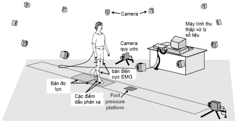 Để có những thông tin định lượng chính xác về dáng đi bình thường cũng như bất thường, người ta thường sử dụng những phương tiện đo lường từ đơn giản đến phức tạp. Các tham số thu được có thể là các thông tin về chuyển động học thẳng và góc cũng như những thông tin về lực động học và năng lượng. Hầu hết các phòng thí nghiệm lượng giá dáng đi đều trang bị những camera (6-8 camerra) ghi hình vận động của cơ thể trong một khoảng không gian nhất định. Mặt nền của đường đi có trang bị những bản ghi lực (force plate) để đo lực phản ứng, từ đó cung cấp các thông tin về lực động học và năng lượng tiêu hao. Cơ thể người được lượng giá được gắn những bộ cảm biến để nhận biết các điểm mốc giải phẫu và cả những điện cực ghi điện cơ đồ. Tất cả những thông tin này được đưa vào một hệ thống máy vi tính xử lý để cho ra những đường biểu diễn về chuyển động học và lực động học dáng đi của đối tượng (hình 7-2). Từ đó, chúng ta sẽ có thể phân tích chính xác về dáng đi của đối tượng để đưa ra kết luận tương ứng.