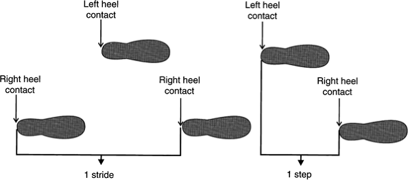 - Nhịp bước đi (Stride): là khoảng từ một sự kiện của một chi đến cùng sự kiện của cùng chi đó ở lần tiếp xúc tiếp theo. Ví dụ: từ lúc chạm gót chân phải đến lúc chạm gót chân phải. Có thể chia nhịp bước đi thành hai bước đi.