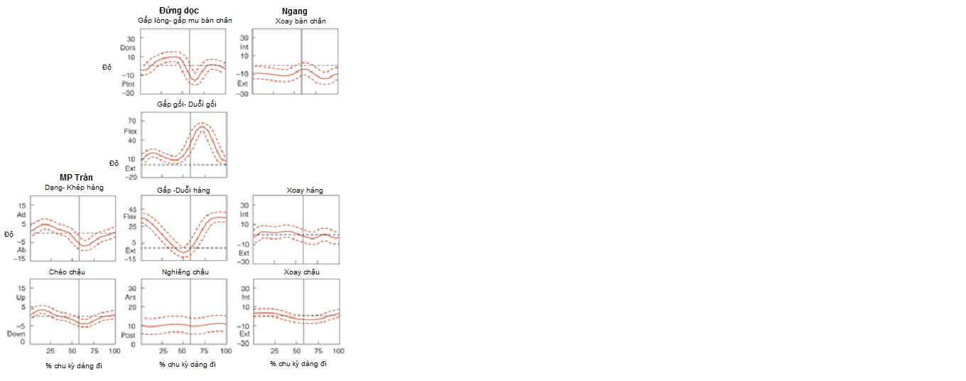 Hình 7-4 biểu diễn sự thay đổi chuyển động học góc của các khớp chi dưới cả ở ba mặt phẳng theo thứ tự là mặt phẳng trán, đứng dọc, và mặt phẳng ngang khi đi.