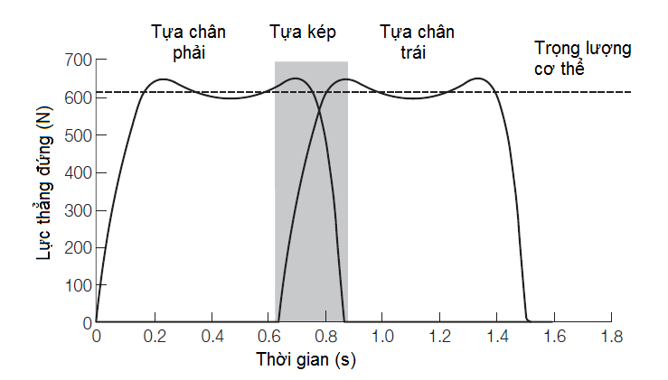 Đánh giá lực động học thường được thực hiện đầu tiên bằng cách đo lực phản ứng của mặt nền lên cơ thể. Hình 7-6 cho thấy đường biểu diễn phản lực nền điển hình khi đi. Đường biểu diễn cho thấy đặc điểm của các giai đoạn tựa đơn và tựa kép và sự chuyển lực từ bàn chân này sang bàn chân kia. Giai đoạn tựa kép, là giai đoạn chuyển lực từ bàn chân này sang bàn chân kia, cho phép kiểm soát tốc độ tải (độ dốc của đường cong) và giữ tốc độ chuyển tương đối thấp. Lực thẳng đứng vẫn giữ tương đối bằng trọng lượng cơ thể suốt giai đoạn tựa đơn, và lực tối đa vào lúc chạm gót và nhấc chân chỉ cao hơn trọng lượng cơ thể một ít. Lực cao ở hai thời điểm này là do cơ thể giảm tốc vào lúc đánh gót và sau đó tăng tốc vào lúc nhấc ngón.